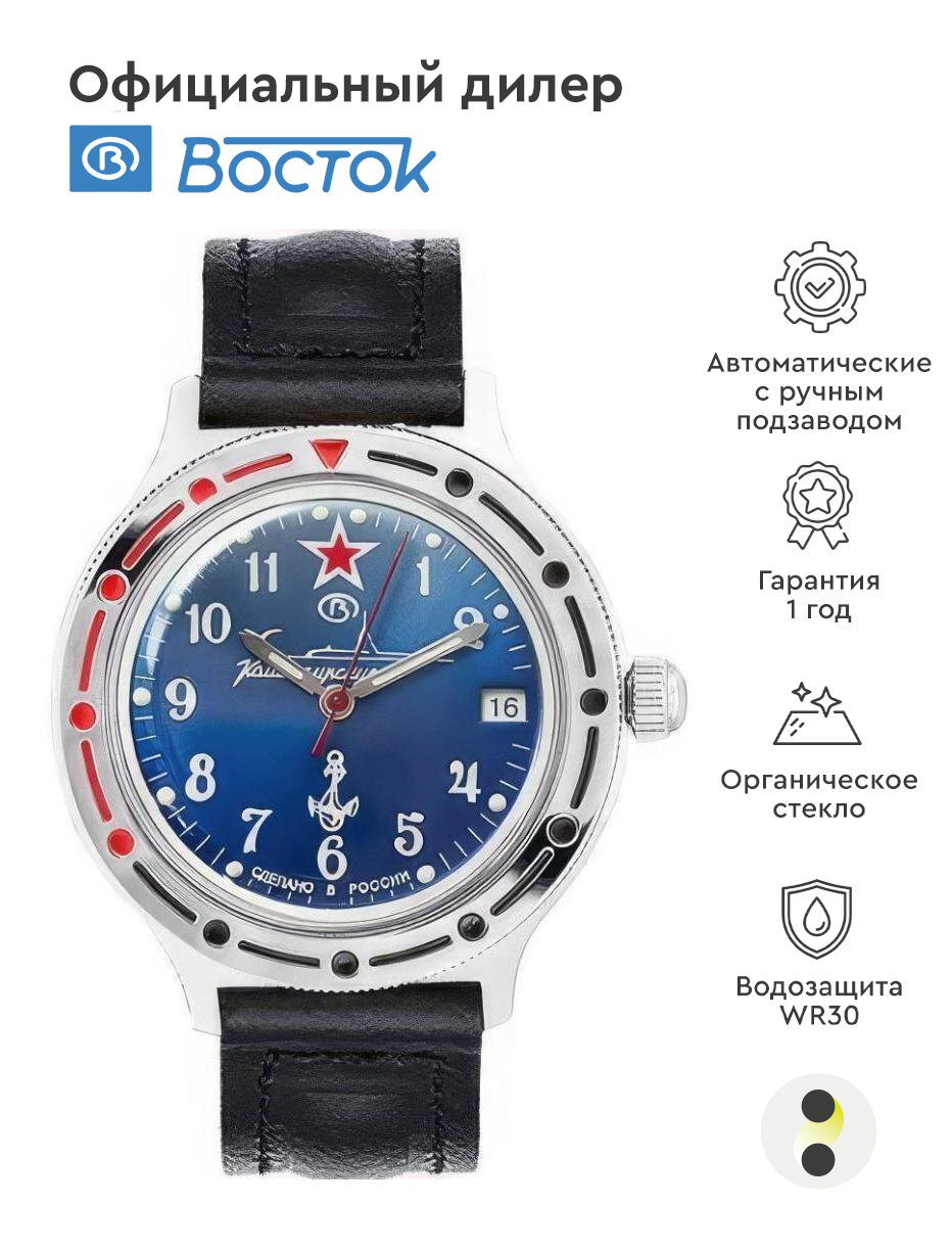 Мужские наручные часы Восток Командирские 921289-classic, натуральная кожа, черный