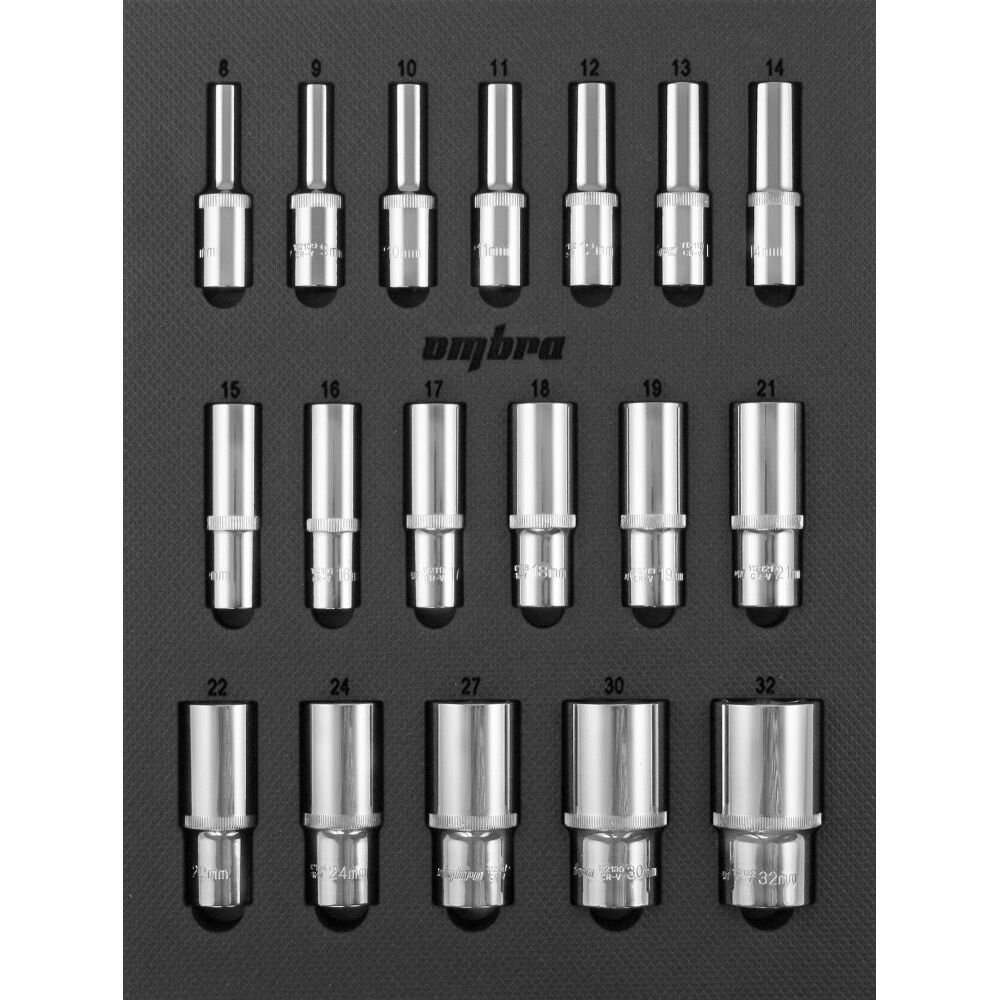 Набор головок торцевых глубоких 1/2" DR 8-32 мм в EVA ложементе 280х375 мм, 18 предметов, OMT18STE, Ombra