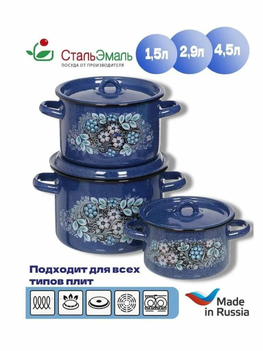 Стальэмаль Набор кастрюль «Голубика», 3 предмета: 1,5 л, 2,9 л, 4,5 л, индукция, цвет синий