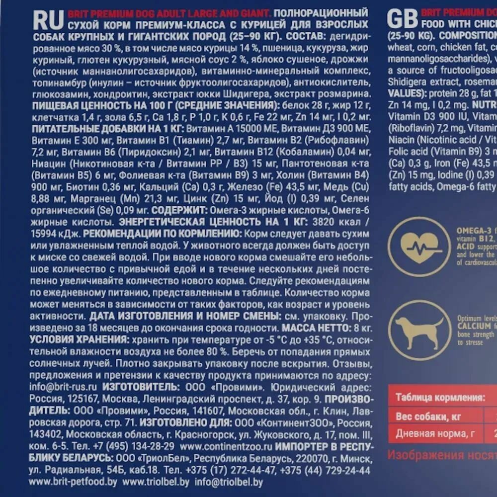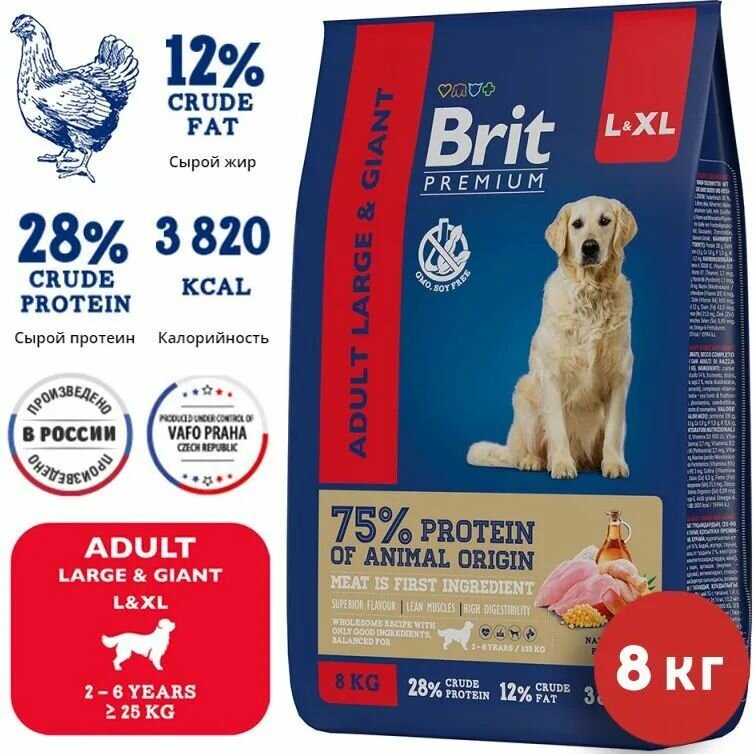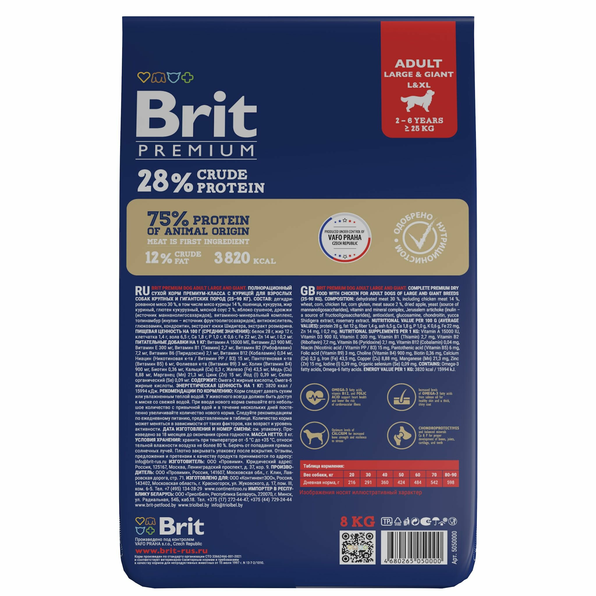 Сухой корм BRIT PREMIUM DOG ADULT LARGE & GIANT для взрослых собак крупных и гигантских пород с курицей (8 кг)