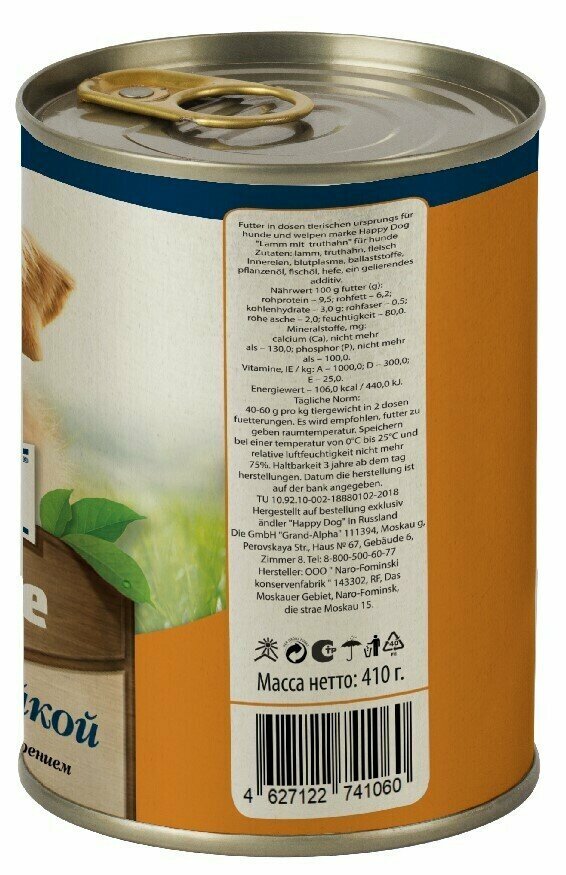Консервы для собак Happy Dog, Ягненок с рисом, 410г