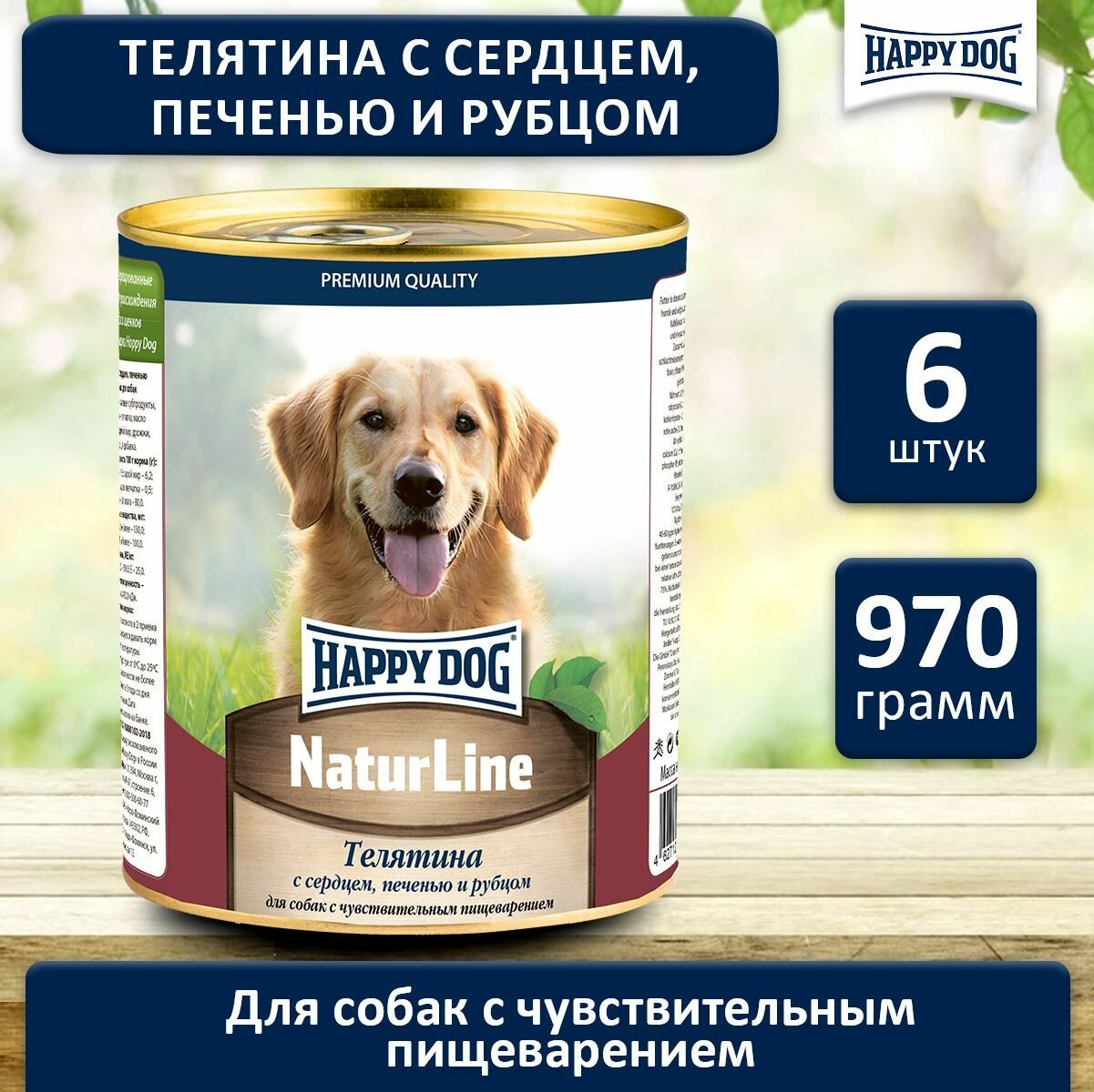 Happy Dog Natur Line консервы для взрослых собак с чувствительным пищеварением с телятиной, сердцем, печенью и рубцом - 970 гр х 6 шт
