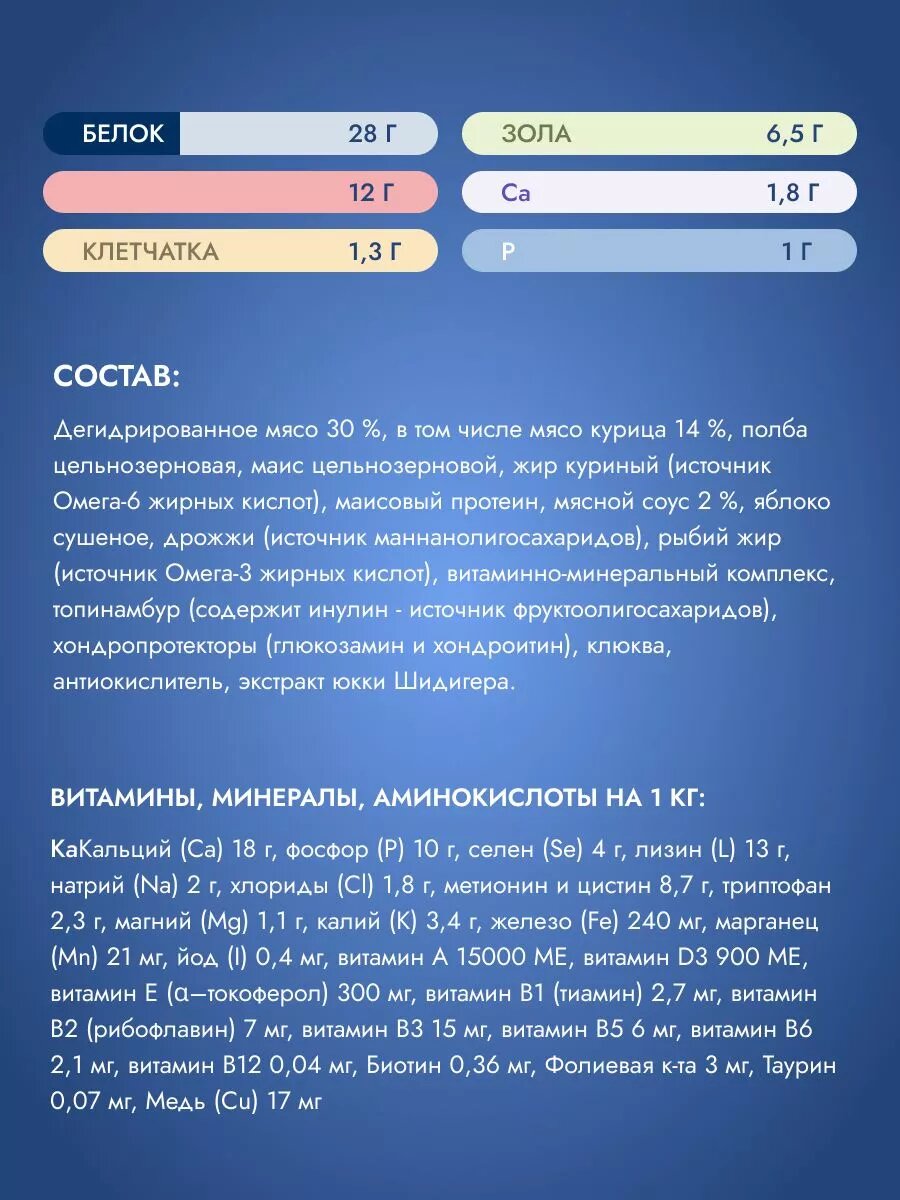| Состав | курица 41%, кукуруза, пшеница, рис, куриный жир (консервирован токоферолами), рыбий жир из лосося, пивные дрожжи, натуральные ароматизаторы, сушеные яблоки, минеральные вещества, экстракт из трав и фруктов 300 мг/кг, маннанолигосахариды 150 мг/кг, фруктоолигосахариды 100 мг/кг, экстракт юкки Шидигера 80 мг/кг, органическая медь, органический цинк, органический селен |
