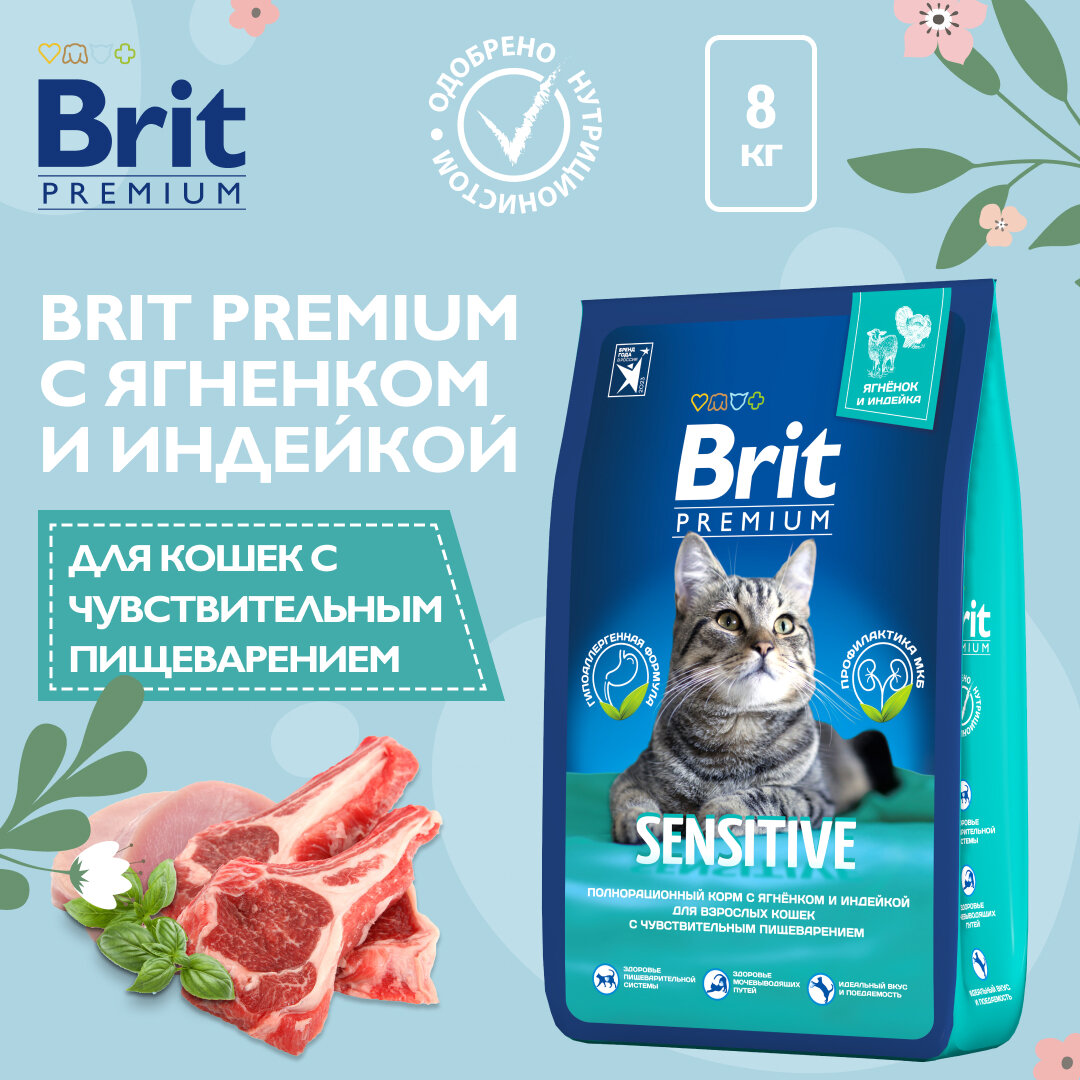 Корм Brit Premium Cat Sensitive для взрослых кошек с чувствительным пищеварением, с ягненком и индейкой 8 кг