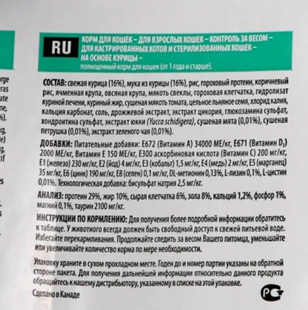 | Отзыв: | Нормализовался вес кота, ест нормально, умеренно, не обжирается и не заскребывает, как с другими кормами. Состав и кбжу очень хорошие. Соотношение цена=качество. Радует, что производство в Канаде. |