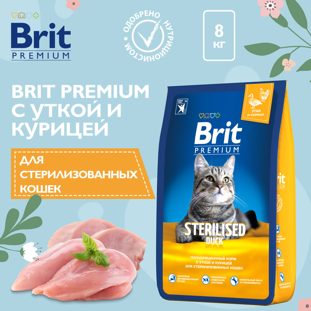 Сухой корм BRIT PREMIUM CAT DUCK & CHICKEN для взрослых кастрированных котов и стерилизованных кошек с уткой и курицей (8 кг)