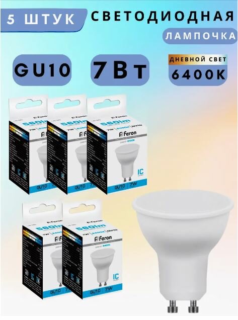 10шт/уп. Лампа LED Спот 7Вт 230B PAR16 GU10 560Лм 6400К Свет Холодный белый арт. 25291 Feron, уп. 10шт