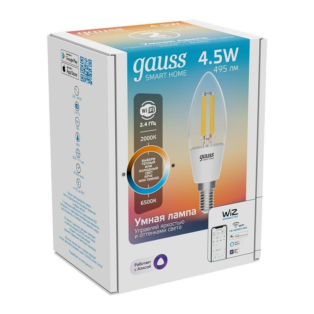 Умная лампа Wi-Fi Gauss Smart Light ССТ DIM E14 C37 4,5 Вт 2700-6500K, диммируемая с изменением температуры, управление голосом/смартфоном