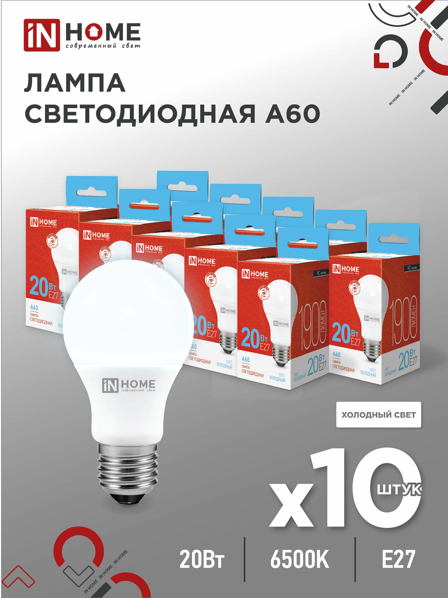 Лампа светодиодная IN HOME LED-A60-VC, Е27, 20 Вт, 230 В, 6500 К, 1900 Лм