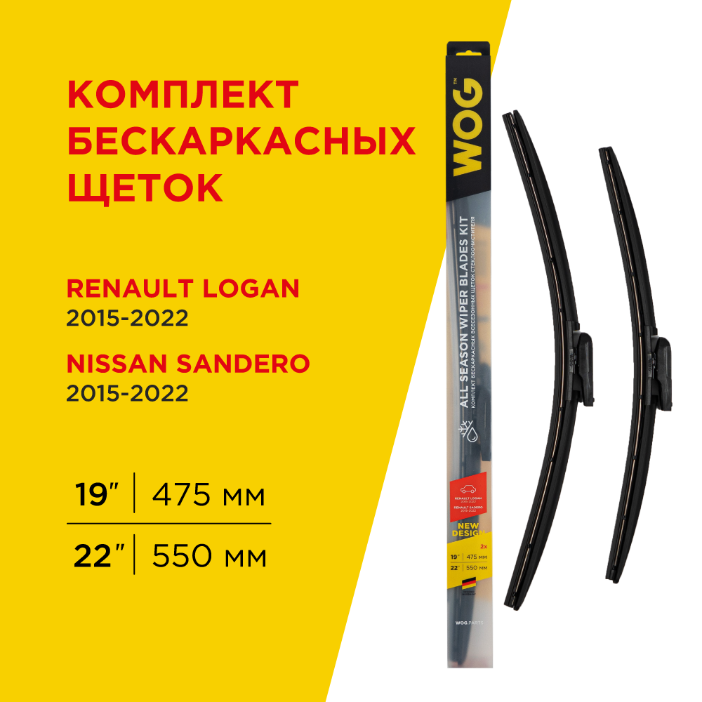 WOG комплект всесезонных бескаркасных бесшумных щеток стеклоочистителя 550/22"+475/19" (logan/sadero .