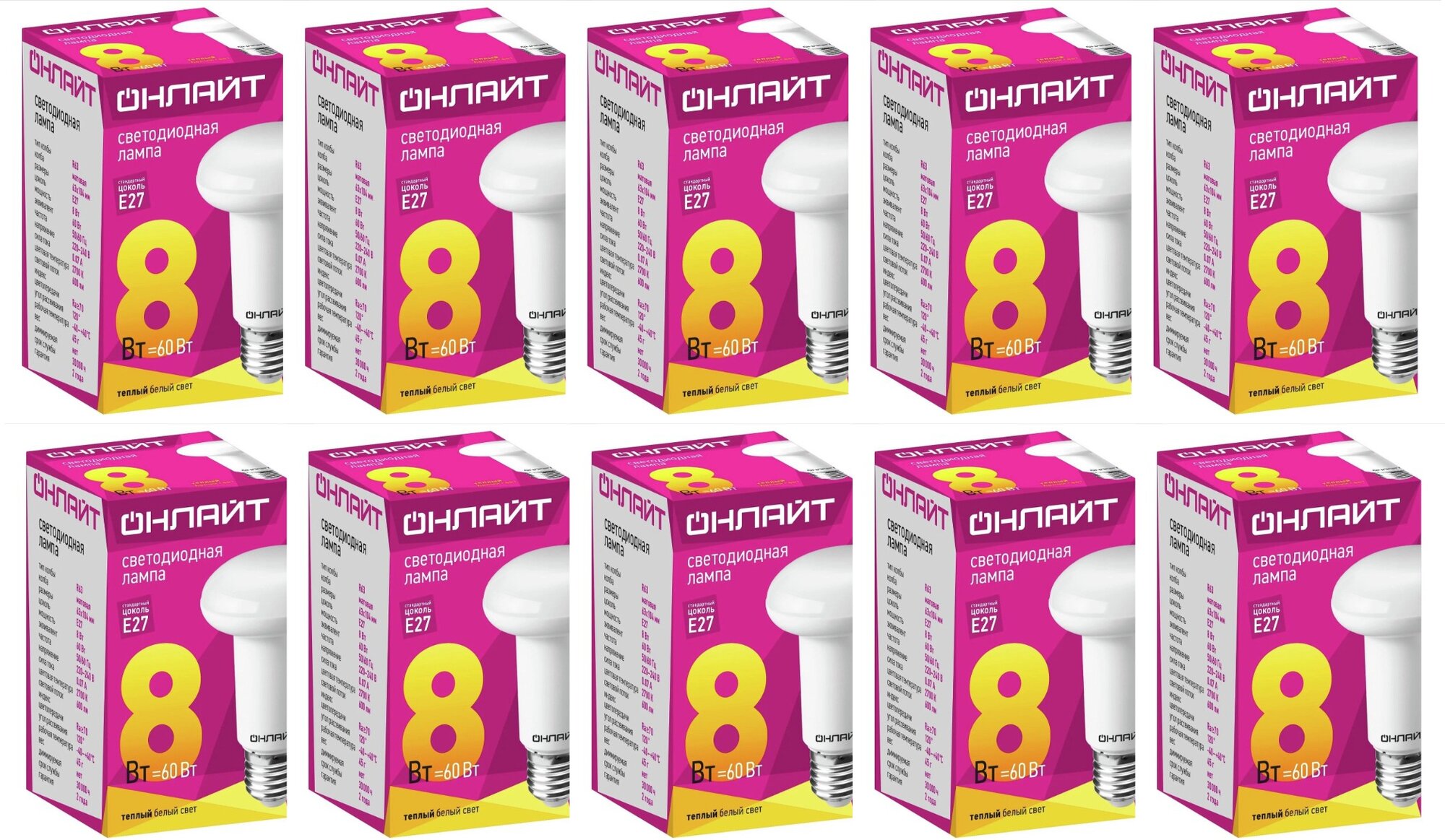 (10 шт.) Светодиодная лампочка онлайт R63 E27 8W(600Lm) 2700K 2K 104x63 ОLL-R63-8-230-2.7K-E27 71653 . Цоколь E27