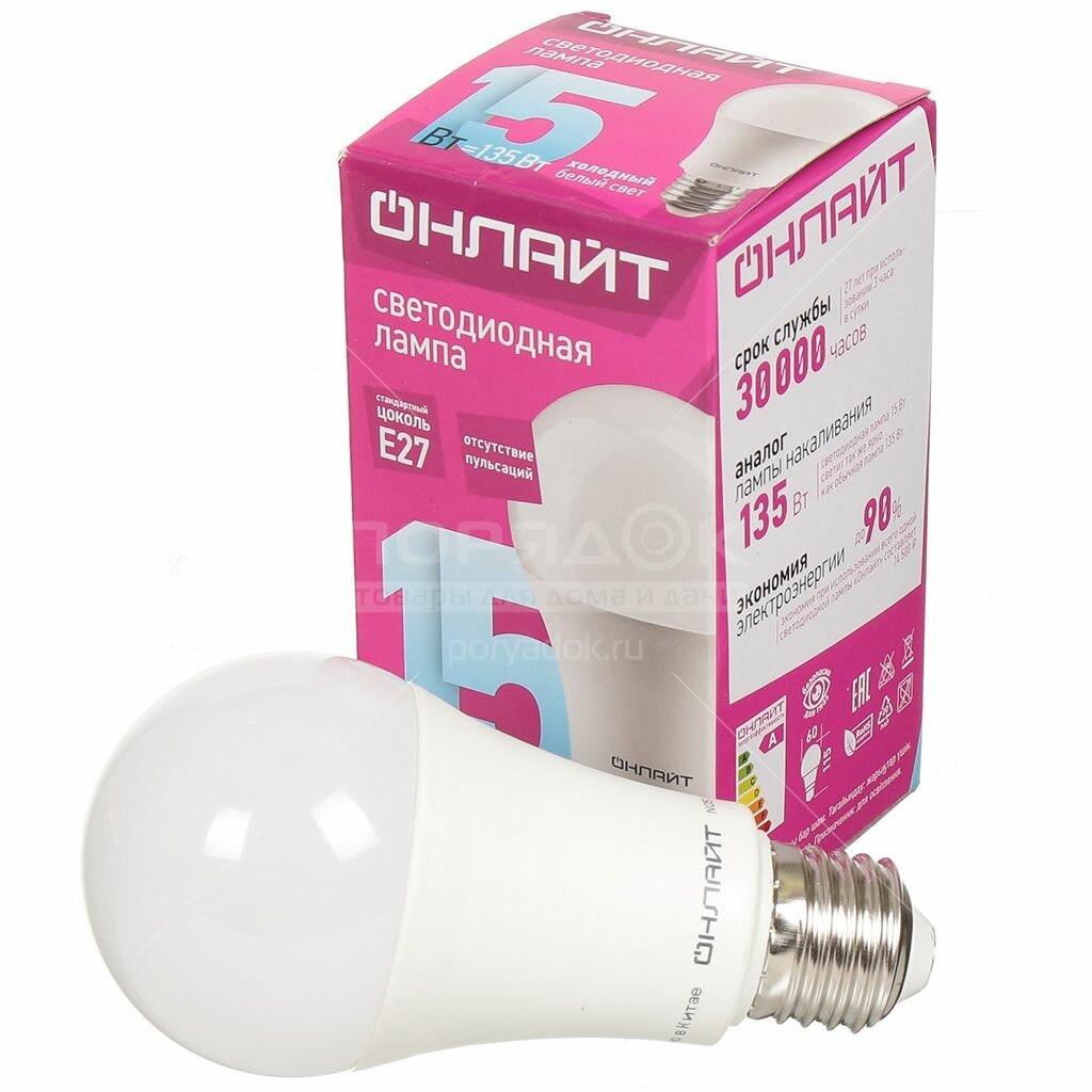 Лампа светодиодная LED Онлайт, E27, A60, 15 Вт, 4000 K, холодный свет