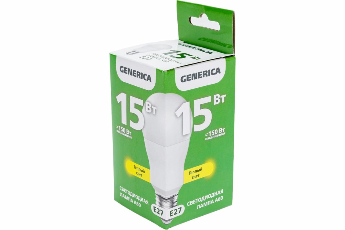 Лампа светодиодная GENERICA A60, 15 Вт, груша, 3000 К, E27, 230 В, LL-A60-15-230-30-E27-G