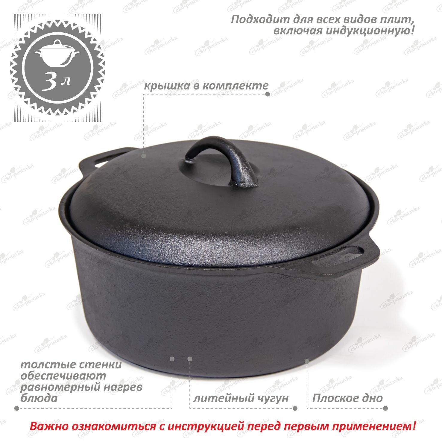 | Плюсы: | Она чугунная и с чугунной крышкой. Объёма 3 литра вполне достаточно. Удобные ручки и на кастрюле и на крышке. Плоское дно |