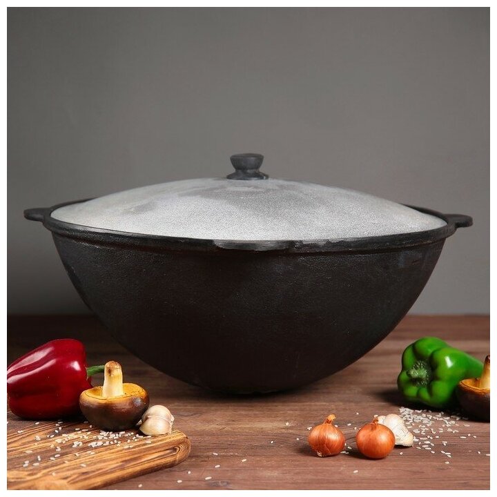 Чугунный казан с круглым дном и крышкой (объем 22 литра), цвет не указан интересное: