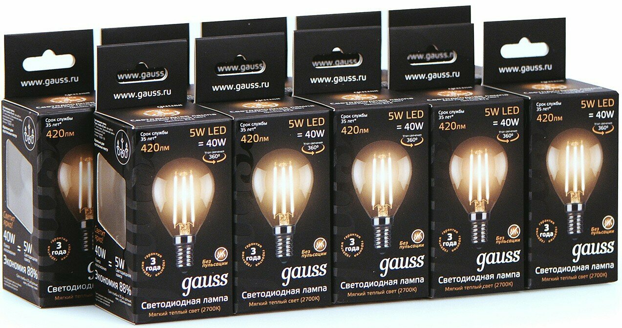 (10 шт.) Светодиодная лампочка Gauss Filament Шар G45 E14 5W(420lm) 2700K 2K 80x45 филамент (нитевидная), прозр. 105801105