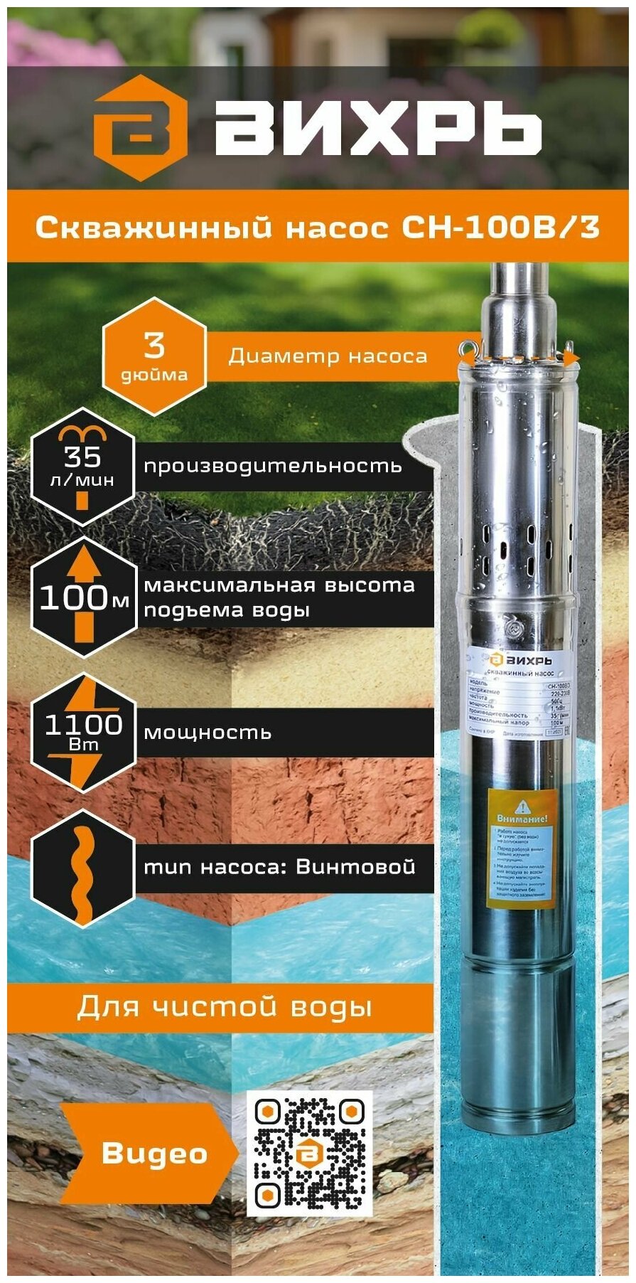 Скважинный насос Вихрь СН-100В/3, 1100 Вт, высота подъема – 100 м, 35 л/мин, 1”