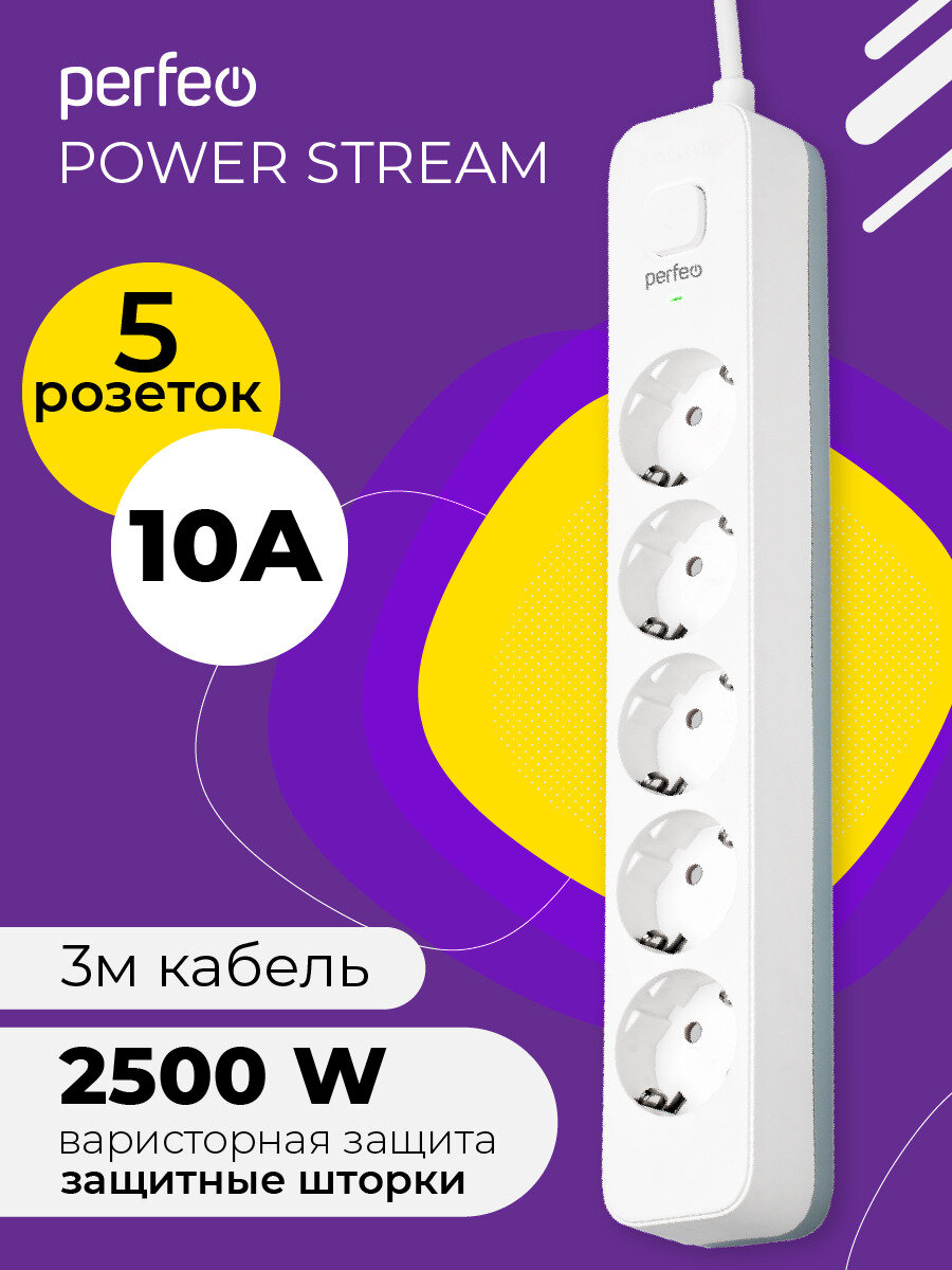 Perfeo, сетевой фильтр, POWER STREAM, 2500W, 3 метра, 5 розеток, белый