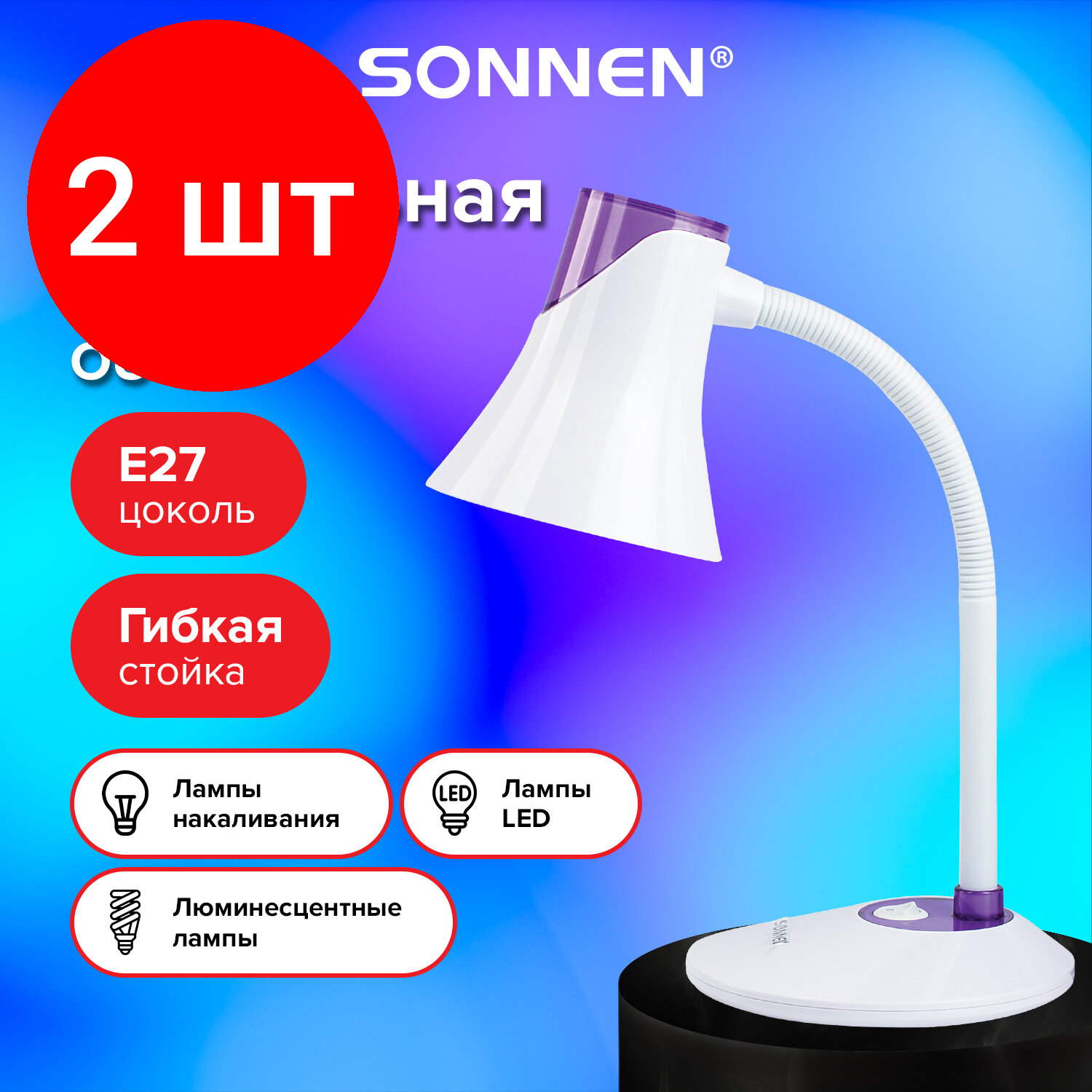 Купить Комплект 2 шт, Светильник настольный SONNEN OU-607, на подставке, цоколь Е27, белый/фиолетовый, 236682