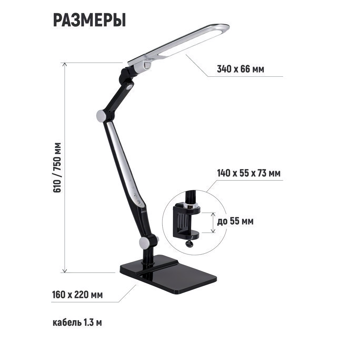 | Дополнительная информация | 2 варианта установки: на подставке и на струбцине; 3 режима свечения: теплый 3000K, нейтральный 4200K, холодный 6300K; регулировка в 6 плоскостях; световой поток светодиодов эквивалентен лампе накаливания мощностью 100 Вт |