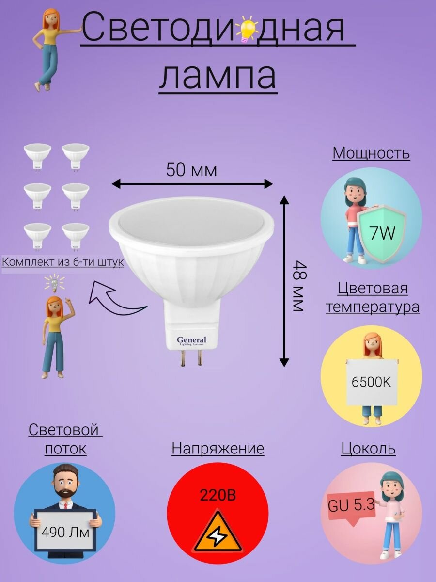 Лампочка светодиодная, General, Комплект из 6 шт., 7 Вт, Цоколь GU5.3, 6500К, Форма лампы Круг, MR16