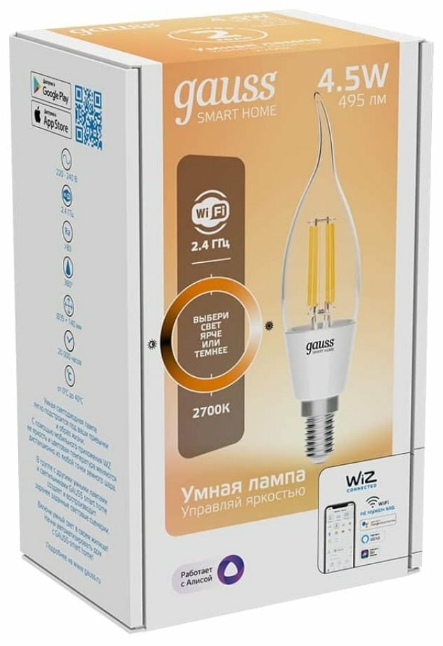 Умная Wi-fi филаментная лампочка Gauss, Smart Light DIM E14 CF35 4,5 Вт 2700-6500K, диммируемая, управление голосом/смартфоном 1260112