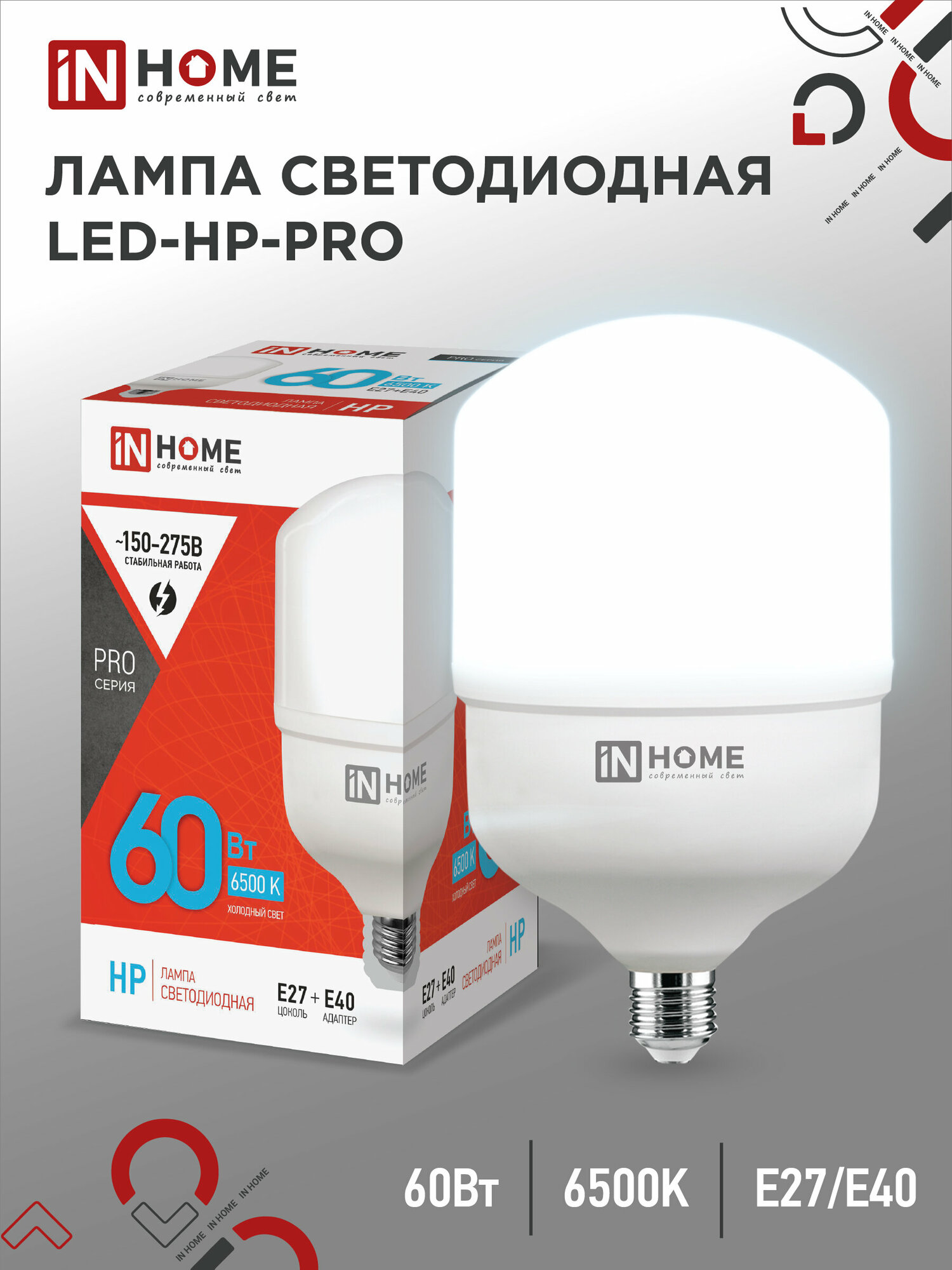 Купить Лампа светодиодная IN HOME LED-HP-PRO, 60 Вт, 230 В, Е27, E40, 6500 К, 5700 Лм, с адаптером