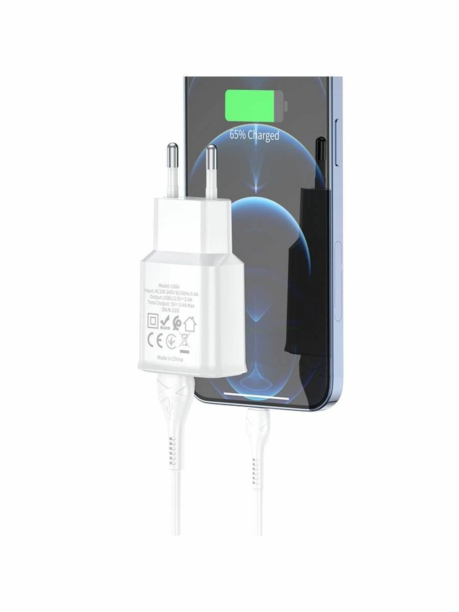 Сетевое зарядное устройство HOCO C88A Star 2xUSB с Кабелем USB - Lightning, 2.4A, 10.8W, белый