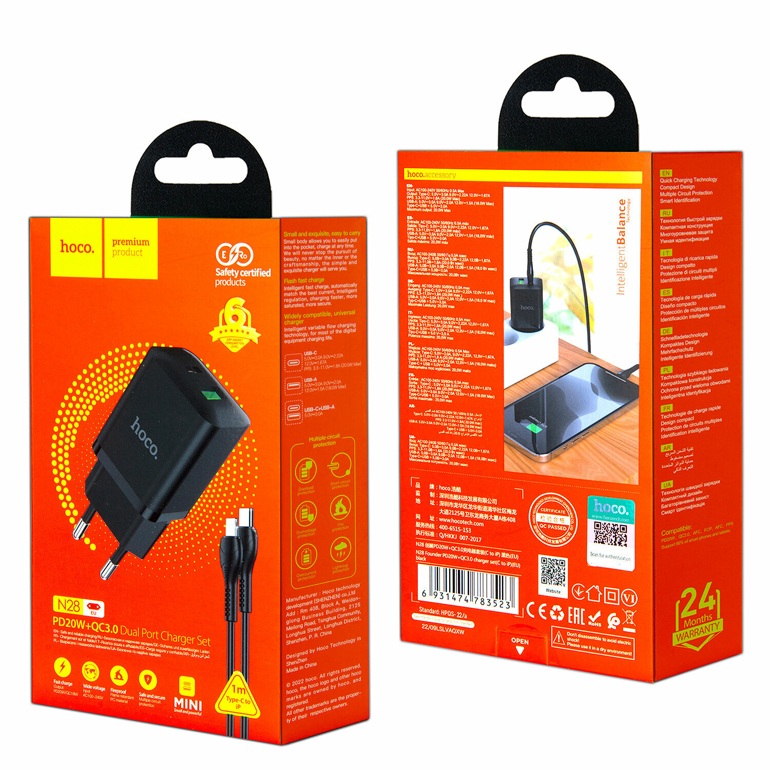 Зарядное устройство Hoco N28 Founder (USB-C PD20W + USB QC3.0) + Кабель Type-C to Lightning 1 m, Черный
