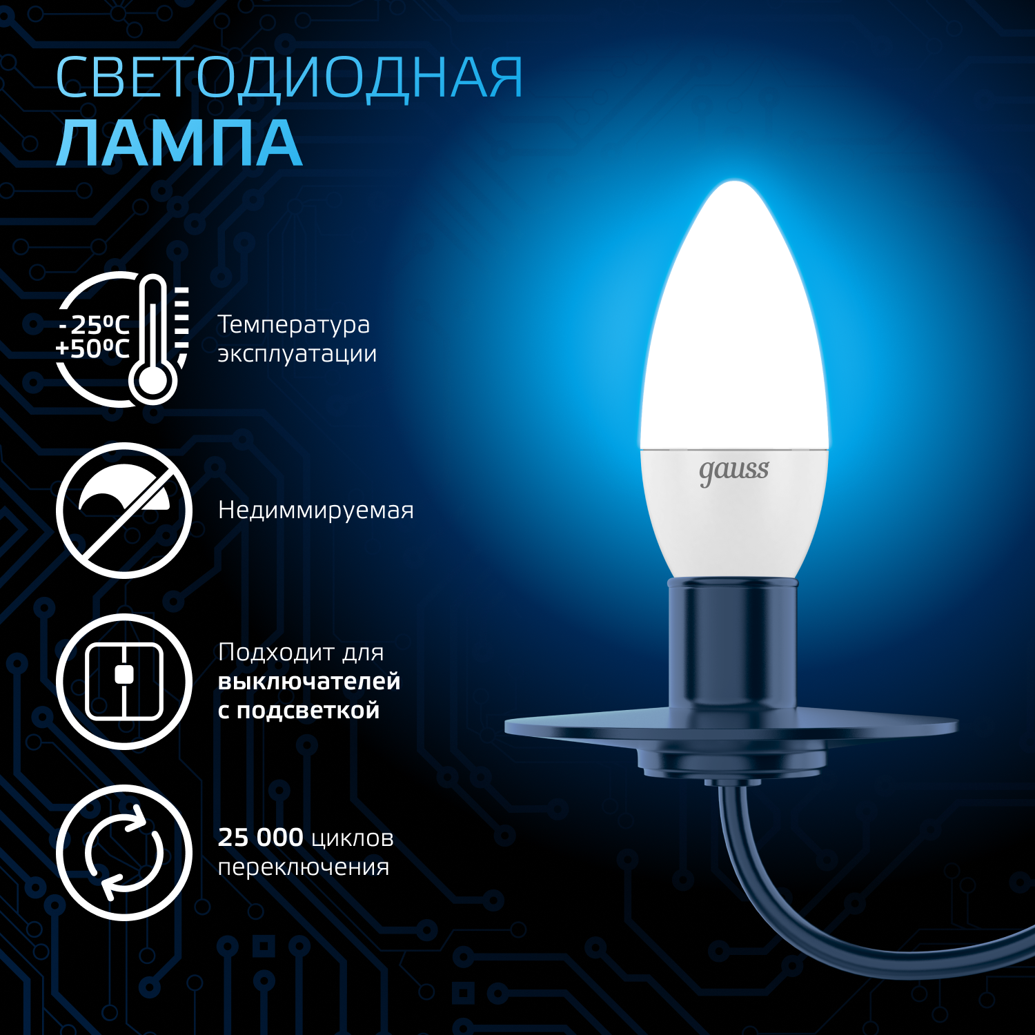 Лампочка светодиодная Е14 Свеча 6.5W холодный белый свет 6500К упаковка 10 шт. Gauss Black