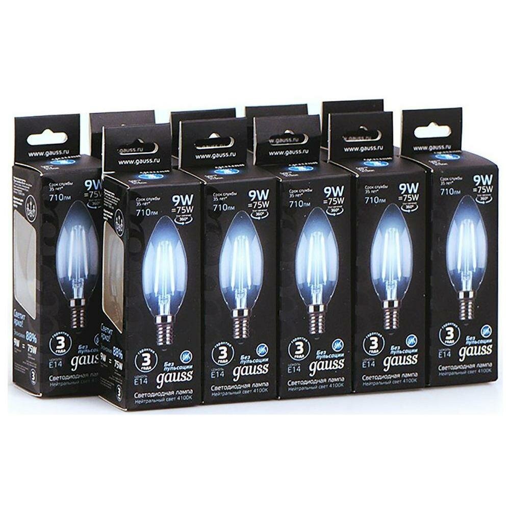 Упаковка ламп филаментная GAUSS E14, свеча, 9Вт, 4100К, белый нейтральный, 10 шт. [103801209]