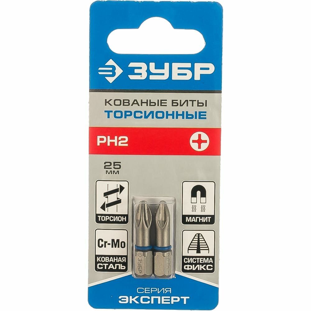 Набор бит ЗУБР Эксперт PH2х25мм, хвостовик С 1/4", Cr-Mo, торсионные, кованые, обточенные, 2шт