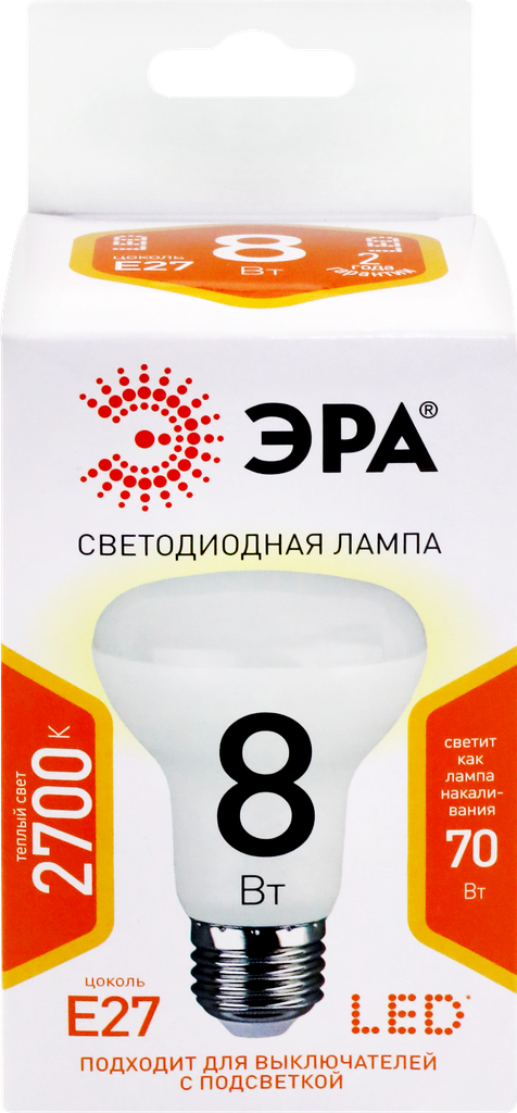 Лампа светодиодная LED 8Вт R63 2700К Е27 тёпл рефл разр выкл с подс Б0020557 ЭРА