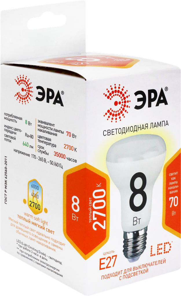 ЭРА LED R63-8W-827-E27 (диод, рефлектор, 8Вт, тепл, E27)