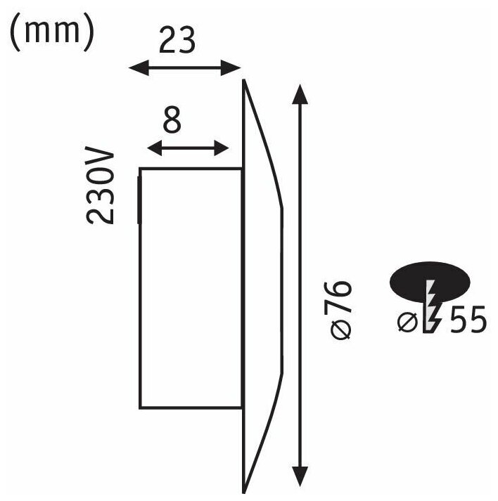 | Ширина/диаметр врезного отверстия | 55 мм |