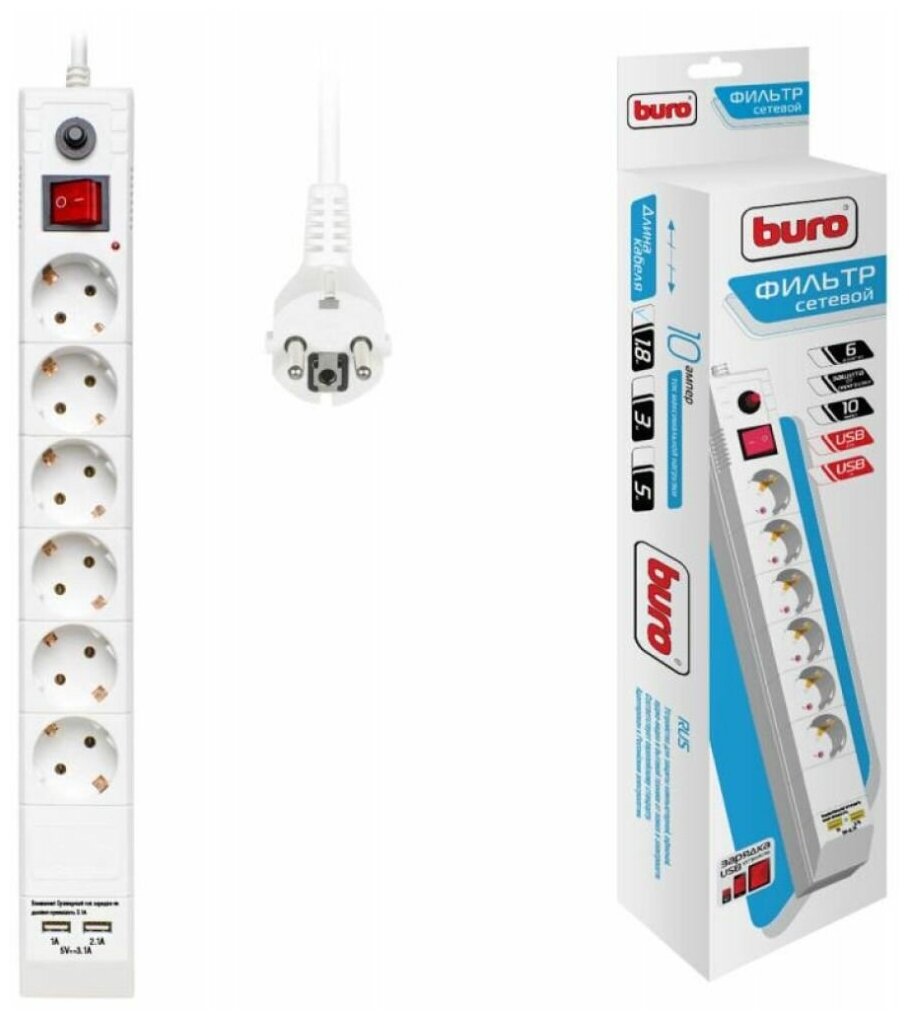 Сетевой фильтр Buro BU-SP1.8_USB_2A-W, 6 розеток, 1.8 м, с/з, 10А / 2200 Вт
