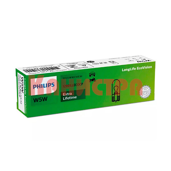 Лампа W5W 12V-5W (W2,1X9,5D) (увелич. Срок службы) LONGLIFE ECOVISION PHILIPS 12961LLECOCP | цена за 1 шт