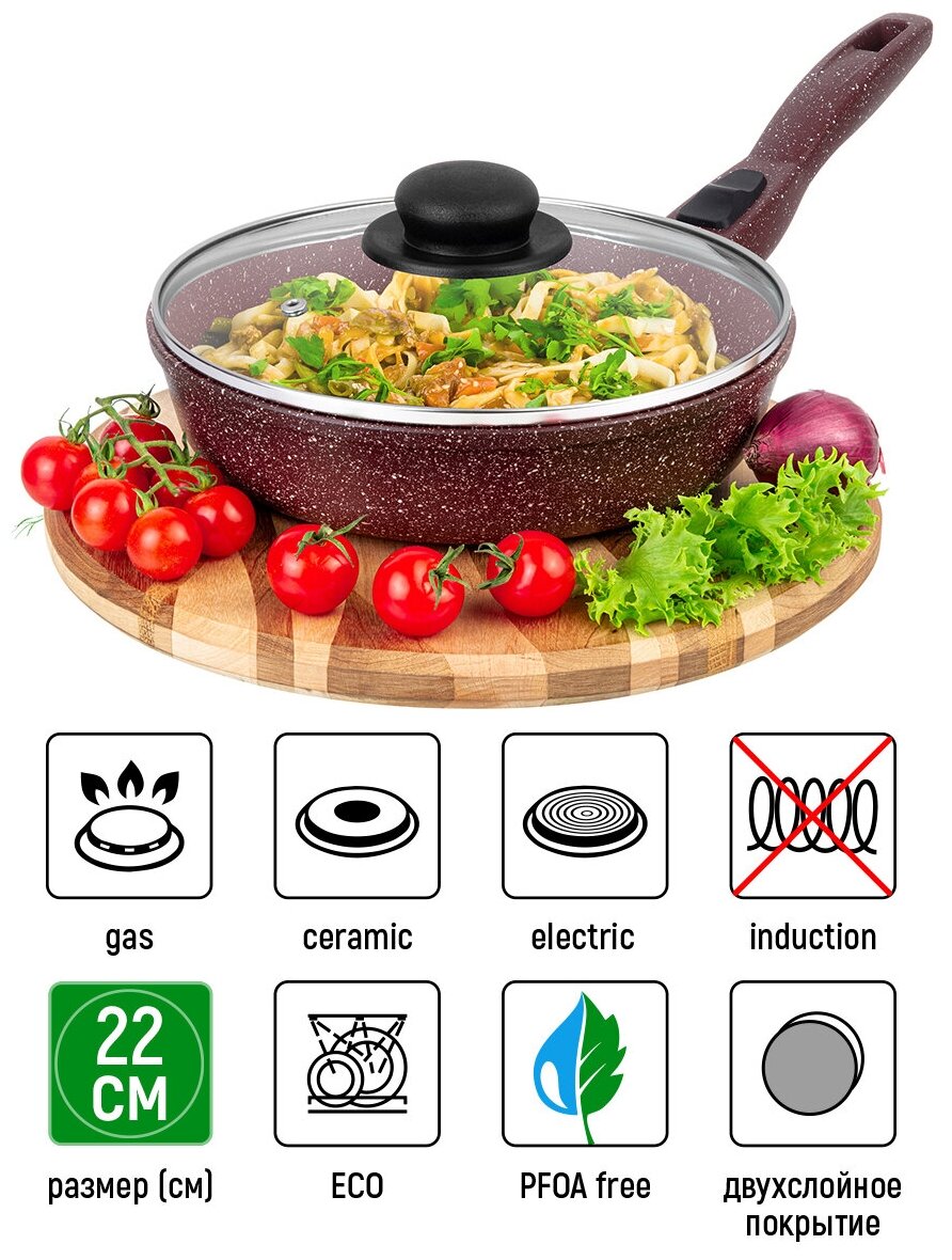 Сковорода глубокая Elan Gallery Гармония вкуса "Рубин" с крышкой, со съёмной ручкой, 22 см интересное: