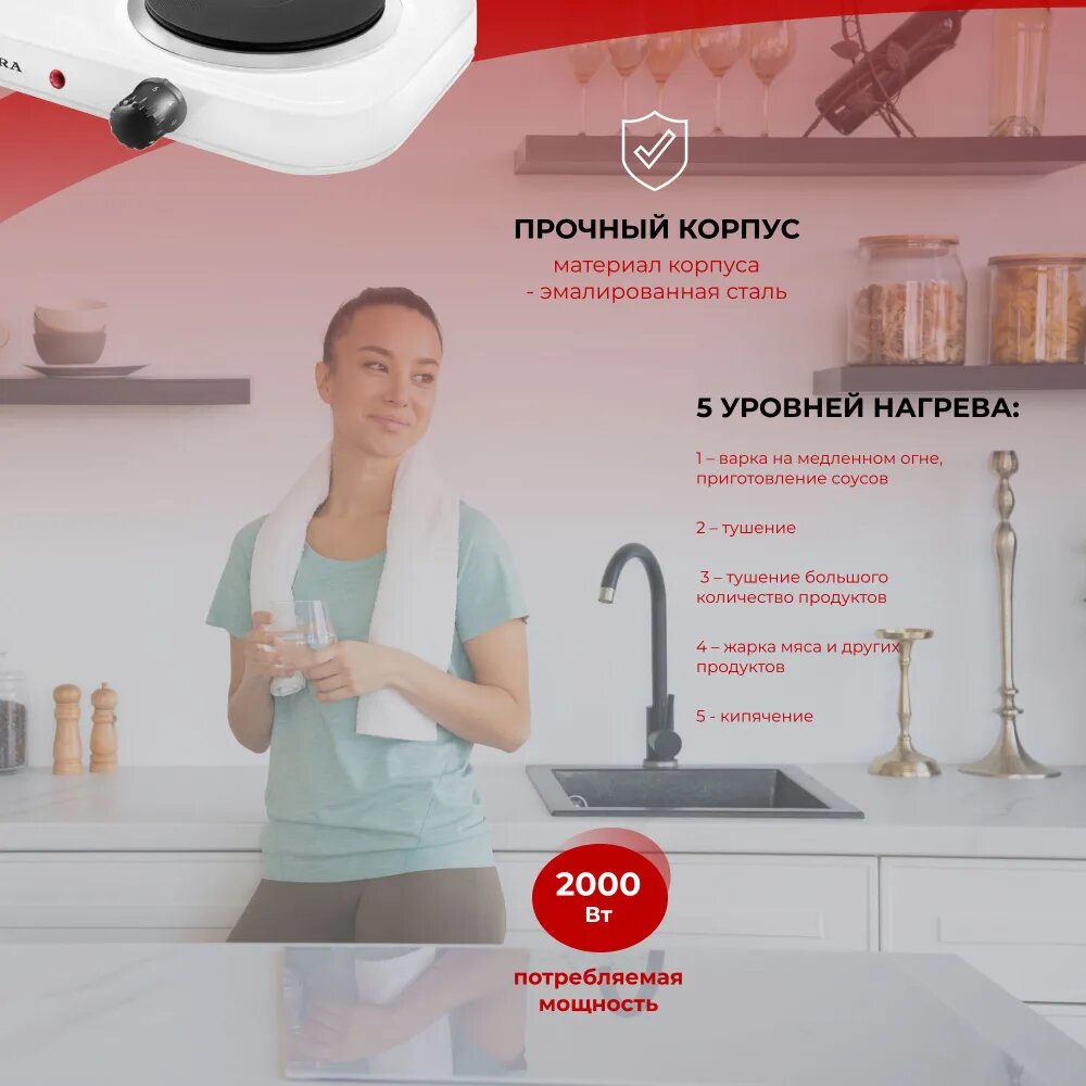 Большая мощность: два киловатта. Две конфорки, Пять режимов работы. При сильном нагреве выключается, когда остывает - снова включается. Еда не пригорает. Конфорки в ней монолитные. Частицы и жидкости не падают под них как в некоторых спиральных плитах. |