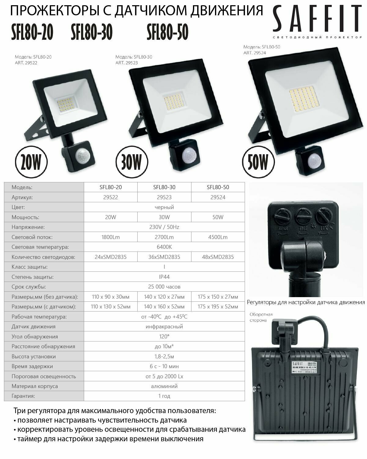 Светодиодный прожектор SAFFIT SFL80-30 IP65 30W 6400K с выносным датчиком движения, черный, 29523