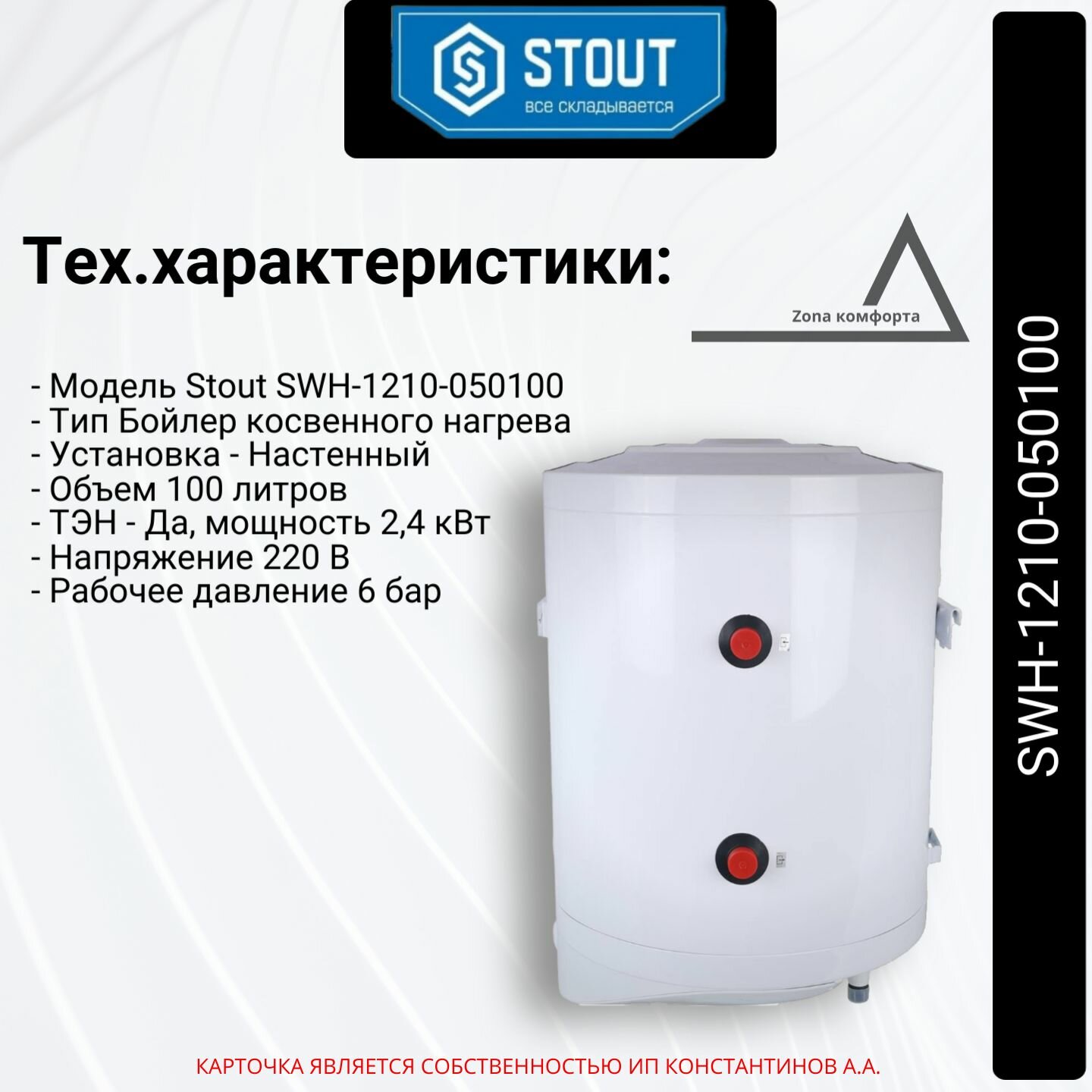 Бойлер комбинированного нагрева настенный 100 л., ТЭН 2,4 кВт, STOUT SWH-1210-050100