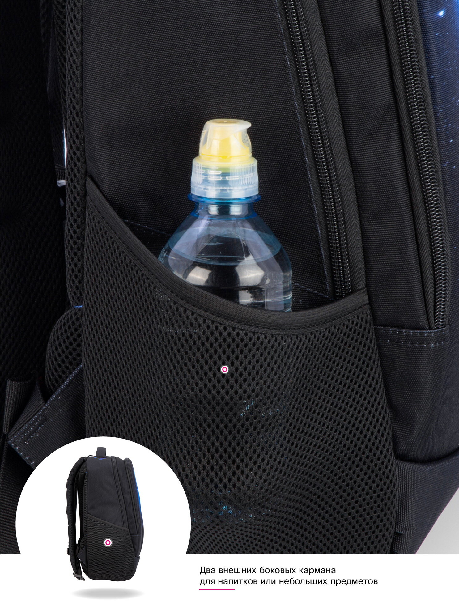 | Специальные отделения | внешние карманы / карман для адреса и ФИО / карман для бутылки / органайзер / отделения для ключей / потайное отделение |