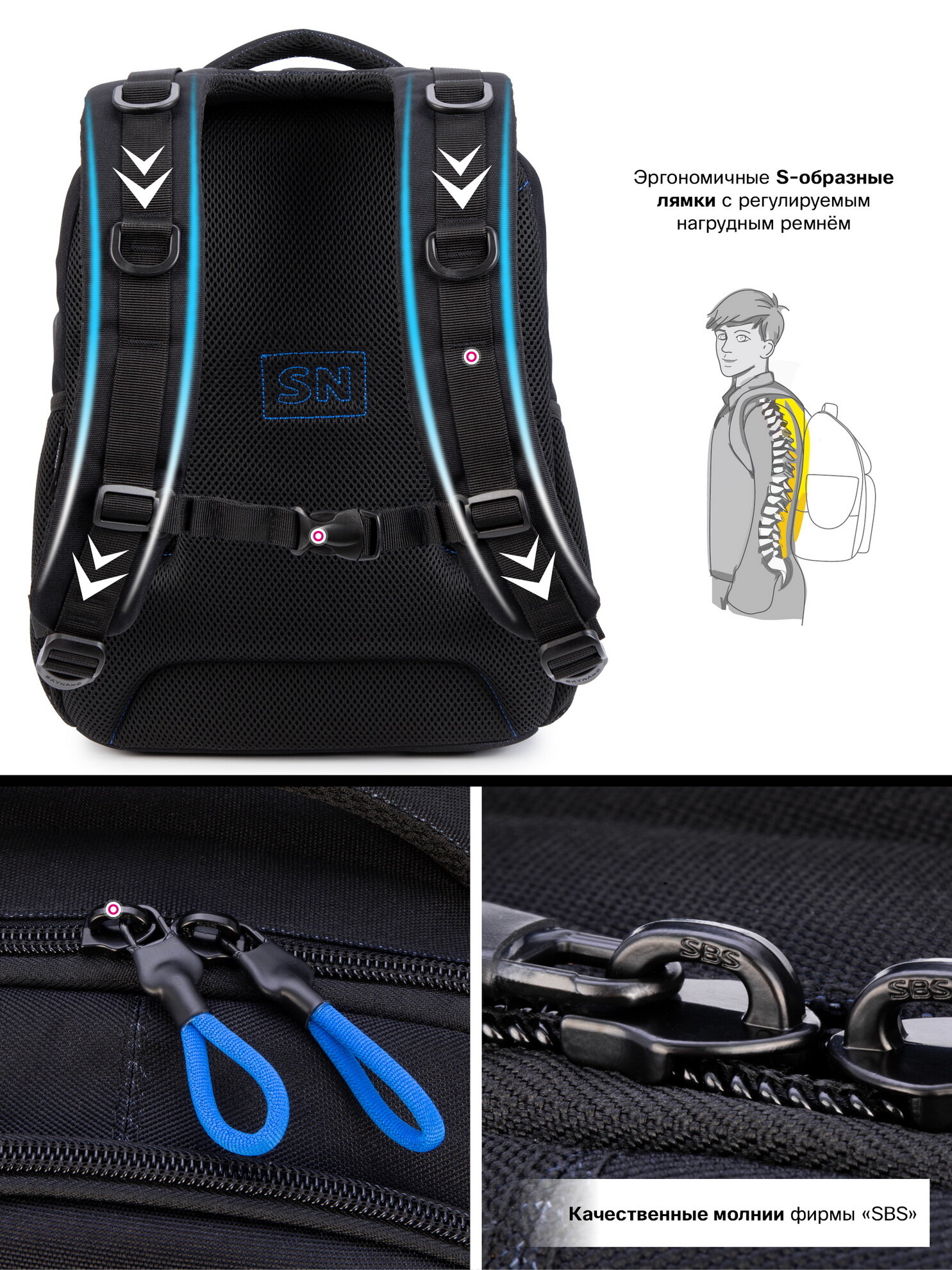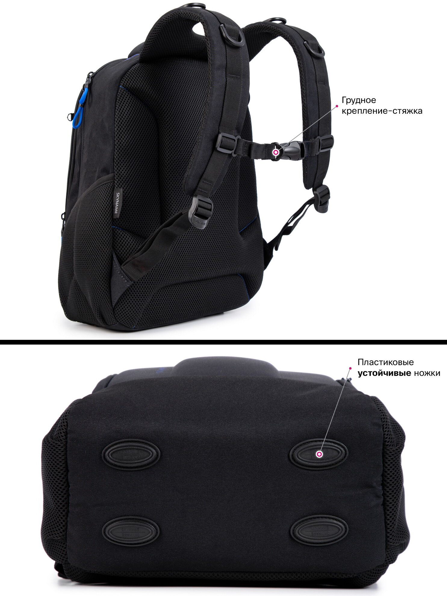 | Особенности | вентилируемая спинка / вентилируемые лямки / водоотталкивающая пропитка / грудная стяжка / жесткое дно / ножки / ортопедический / разделитель в главном отделении / разъем USB / регулируемые лямки / ручка для переноски / с наполнением / эргономичная спинка |
