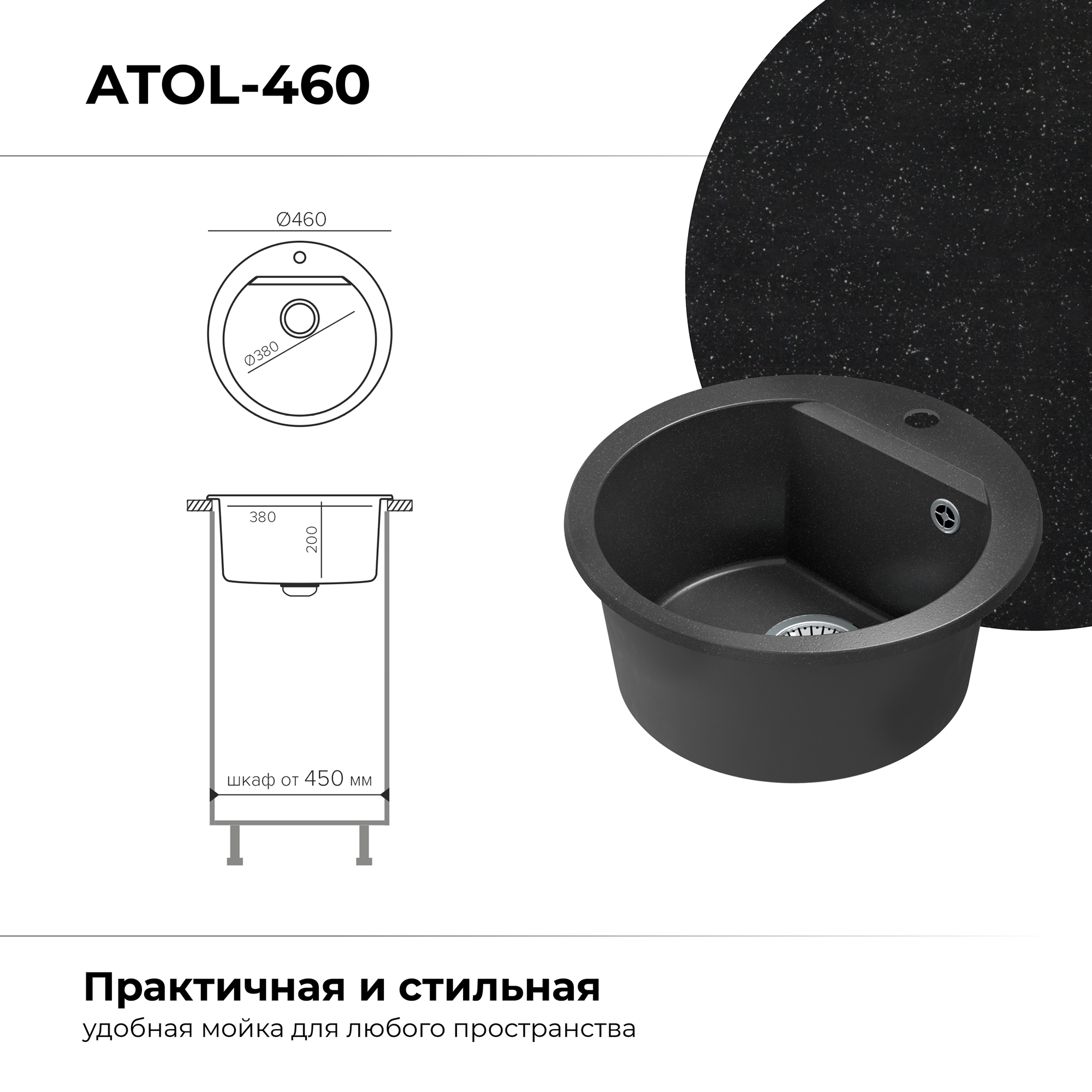 Мойка POLYGRAN, гранит-мрамор, ATOL-460, (d=460*200 мм), черный, сифон и сливная арматура