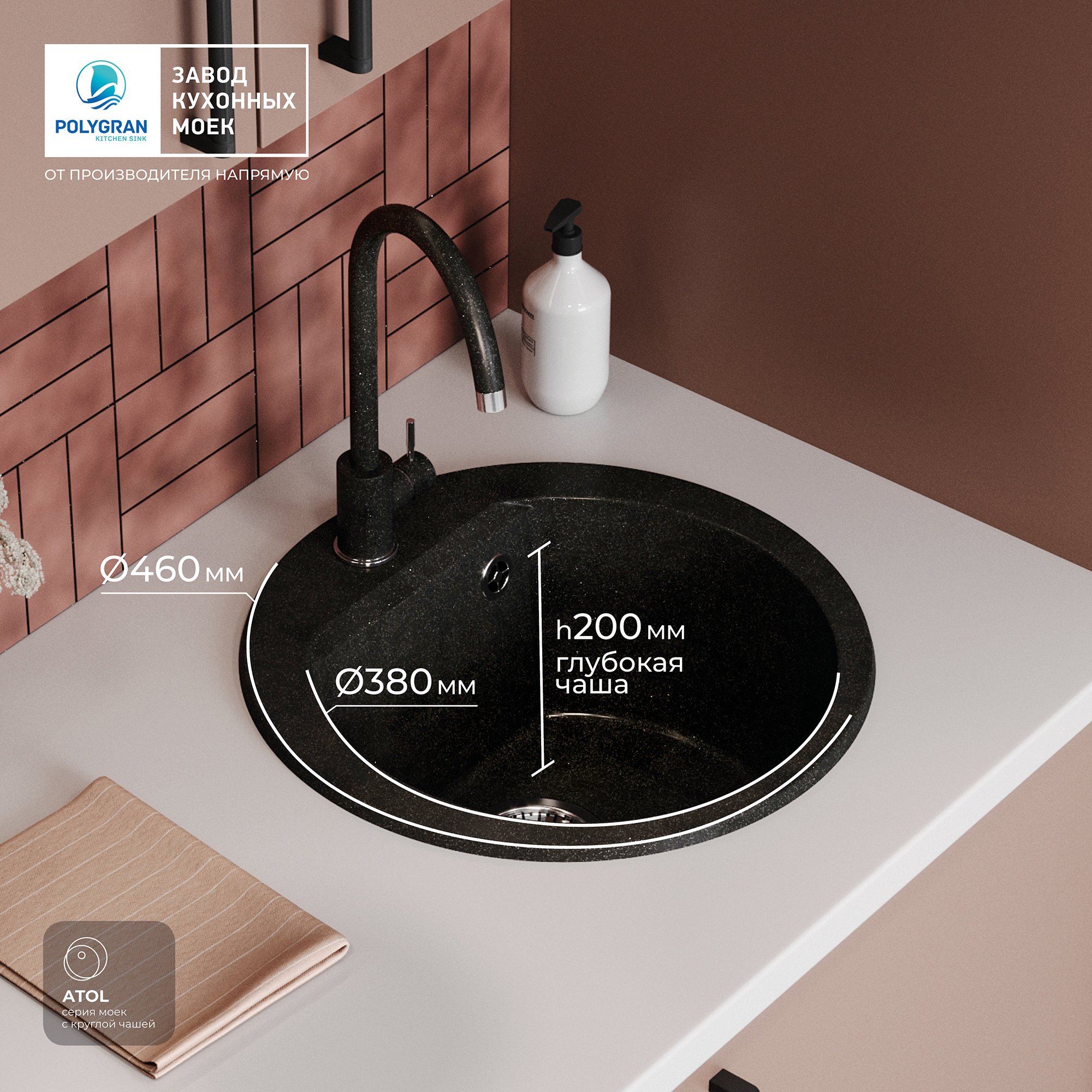 Мойка POLYGRAN, гранит-мрамор, ATOL-460, (d=460*200 мм), черный, сифон и сливная арматура
