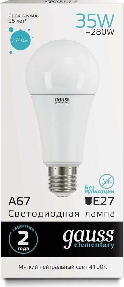 Лампа светодиодная gauss Elementary 70225, E27, A67, 35 Вт, 4100 К