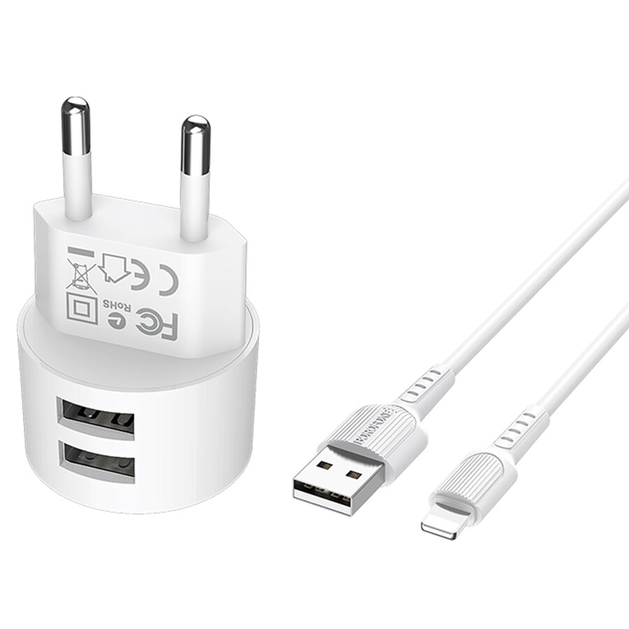 Сетевое зарядное устройство Borofone BA23A, 2xUSB, 2.4 А, кабель Lightning, белое