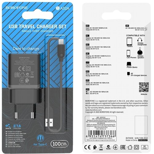 Сетевое ЗУ Borofone BA48A + кабель Type-C (1USB/2.1A) черное