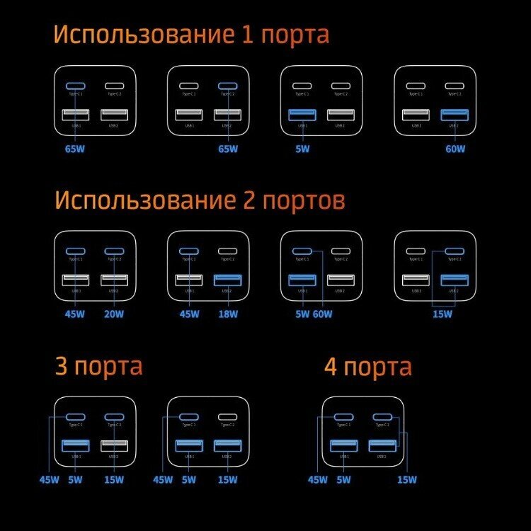 | Минусы: | Если я правильно понял работу, то быстрая зарядка только у type-c, у usb нет |
