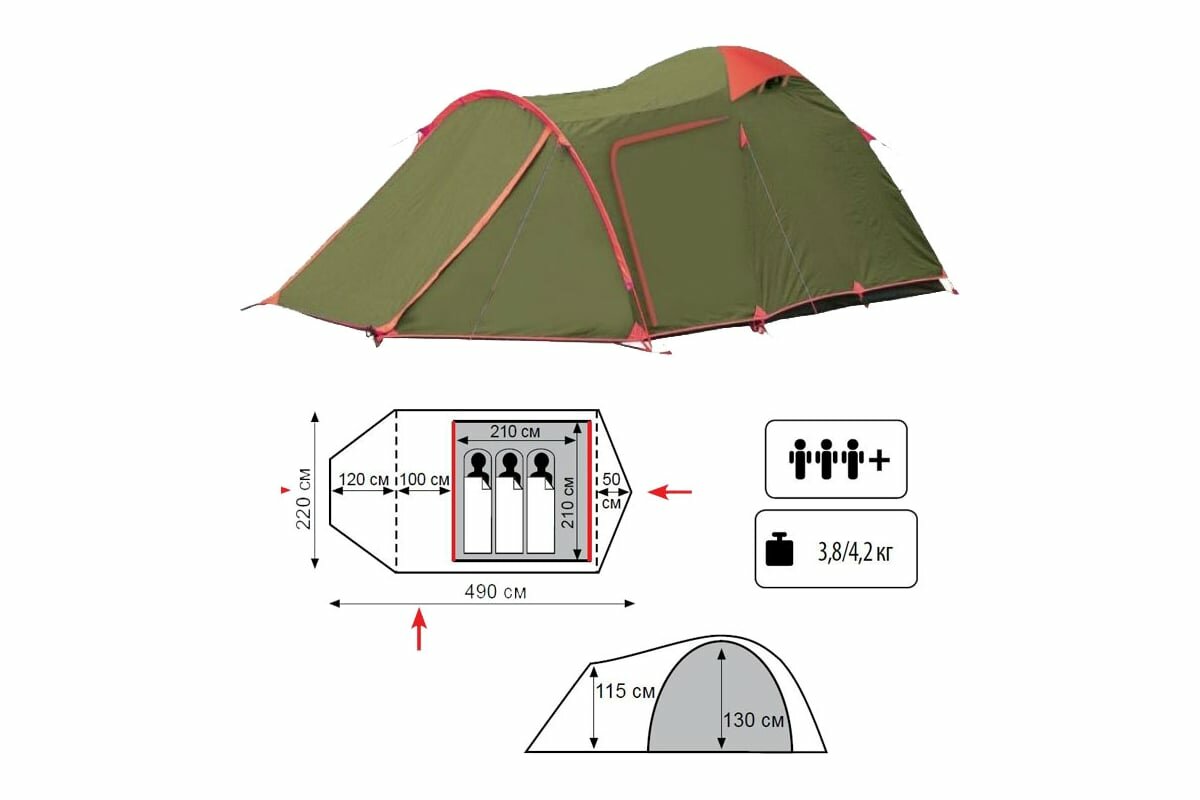 | Габариты внешней палатки(ДxШxВ) | 490x220x130 cм |